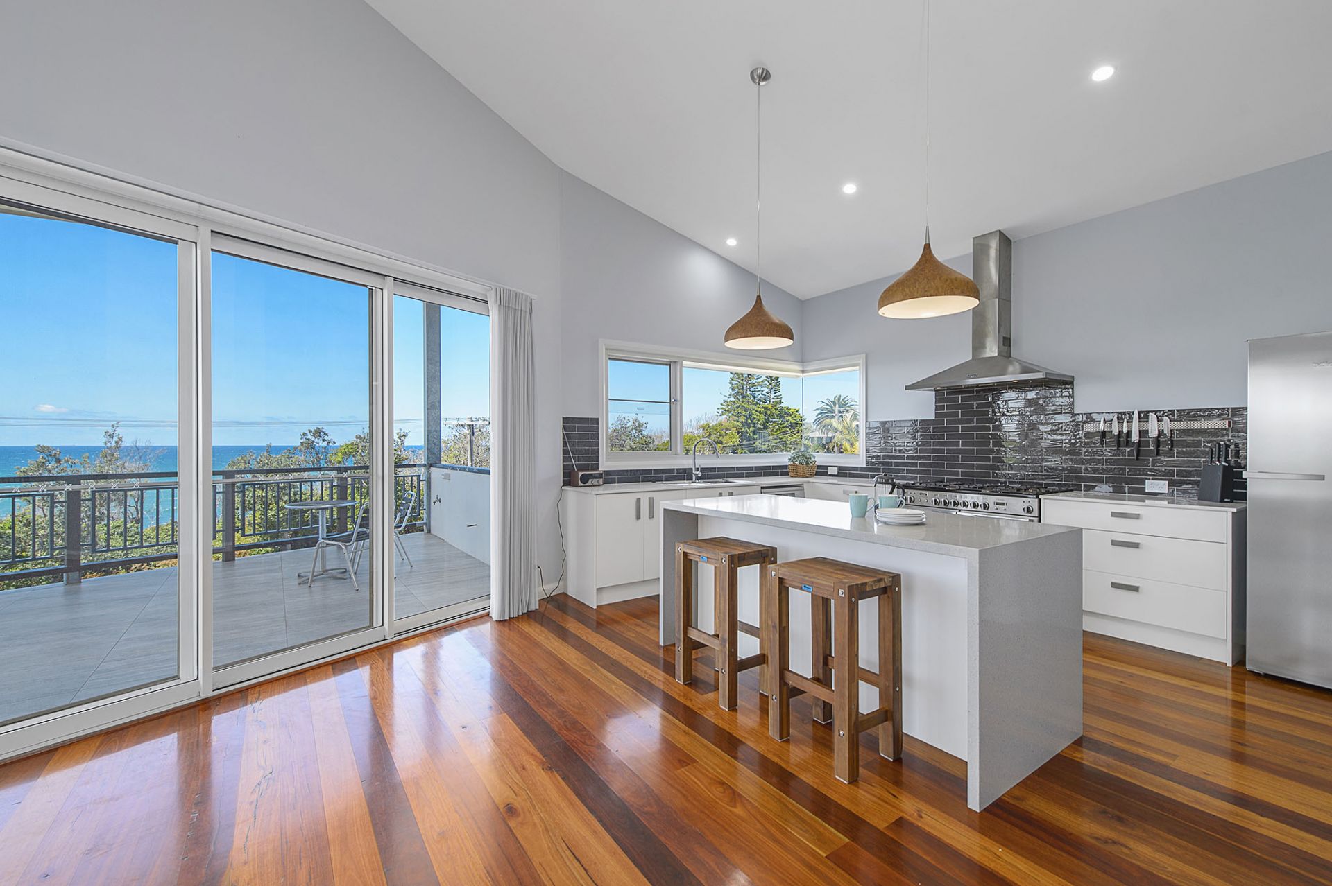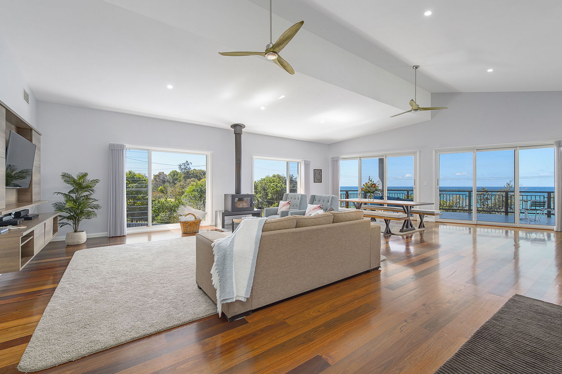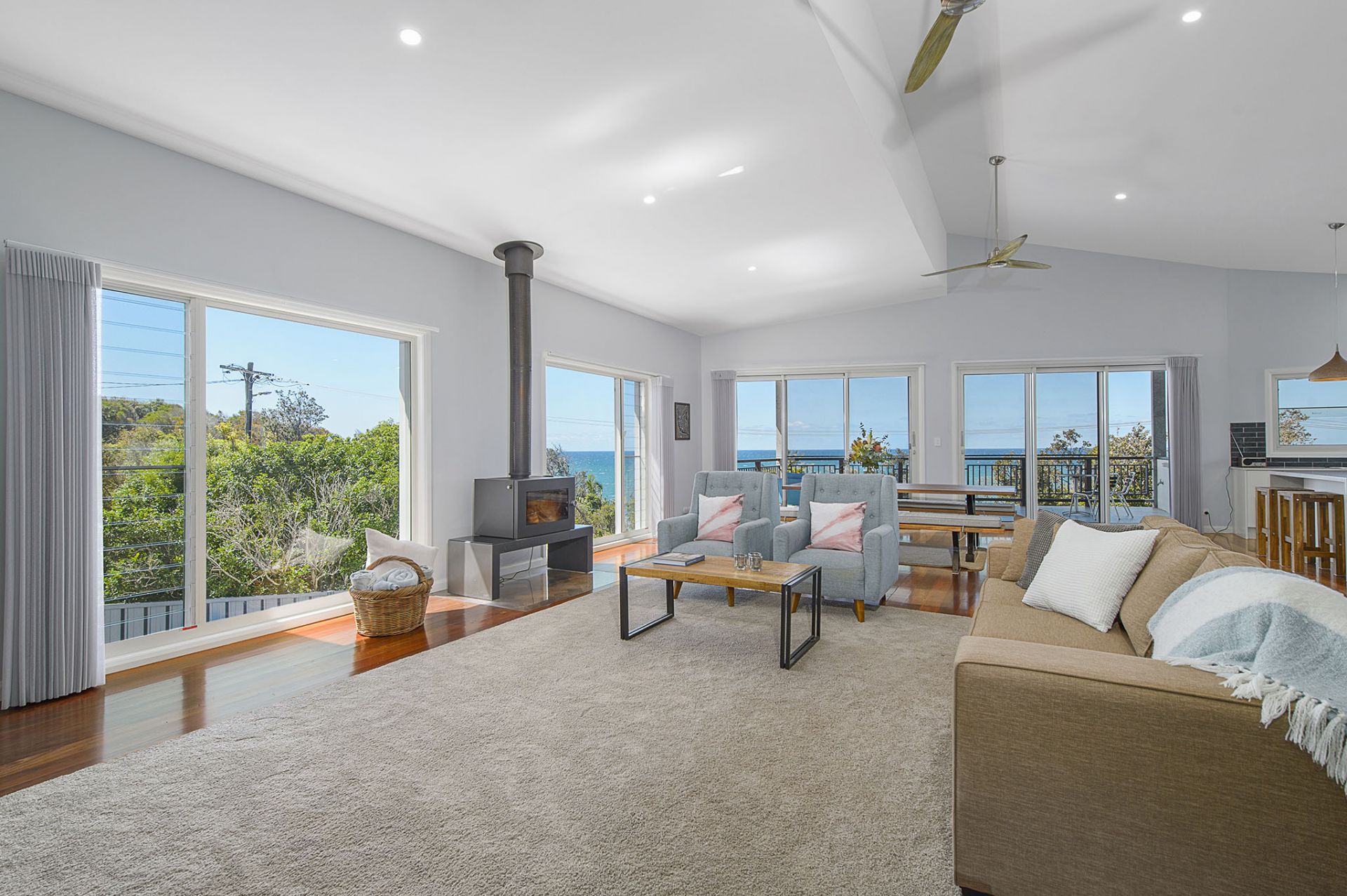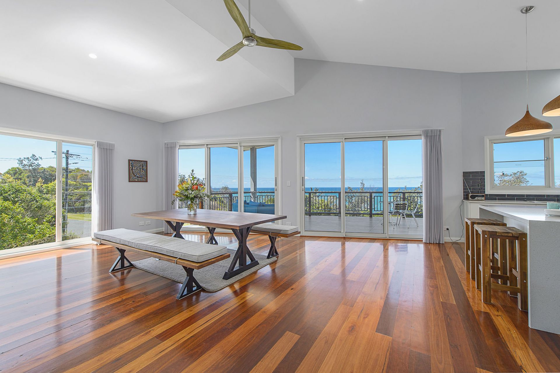 The spacious open-plan living area features vaulted ceilings that seamlessly extend to a large covered entertaining deck, perfect for soaking in the panoramic ocean vista.