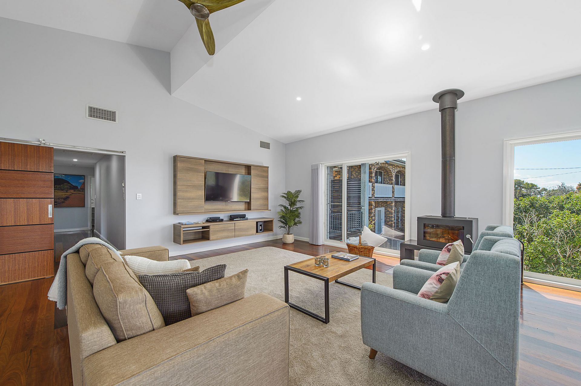 - Living area with wood fire heater, ducted air conditioning & ceiling fans
