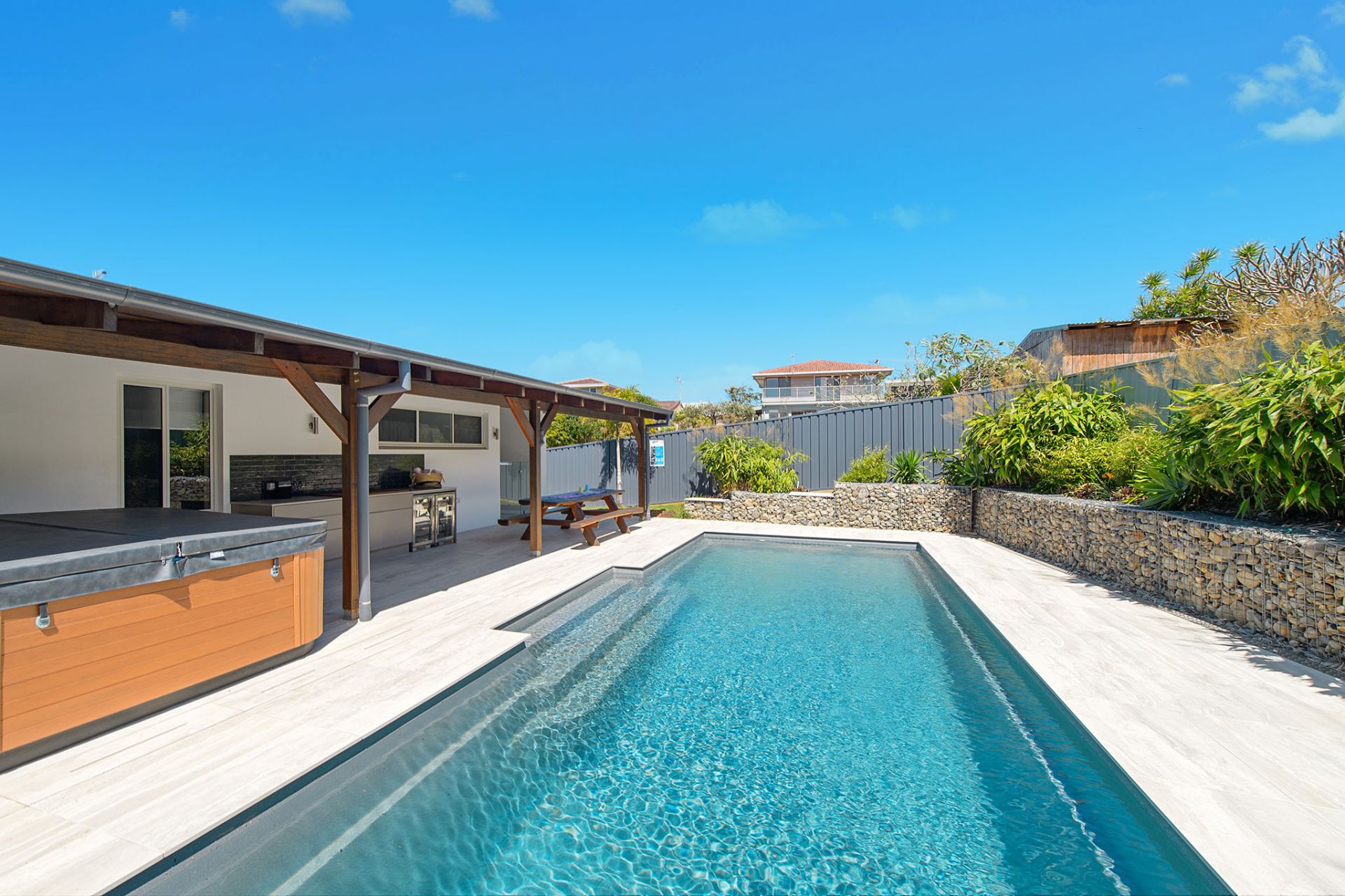 Step outside to your private backyard, surrounded by tropical landscaping. Enjoy the covered entertaining area and take a dip in the in-ground saltwater swimming pool.