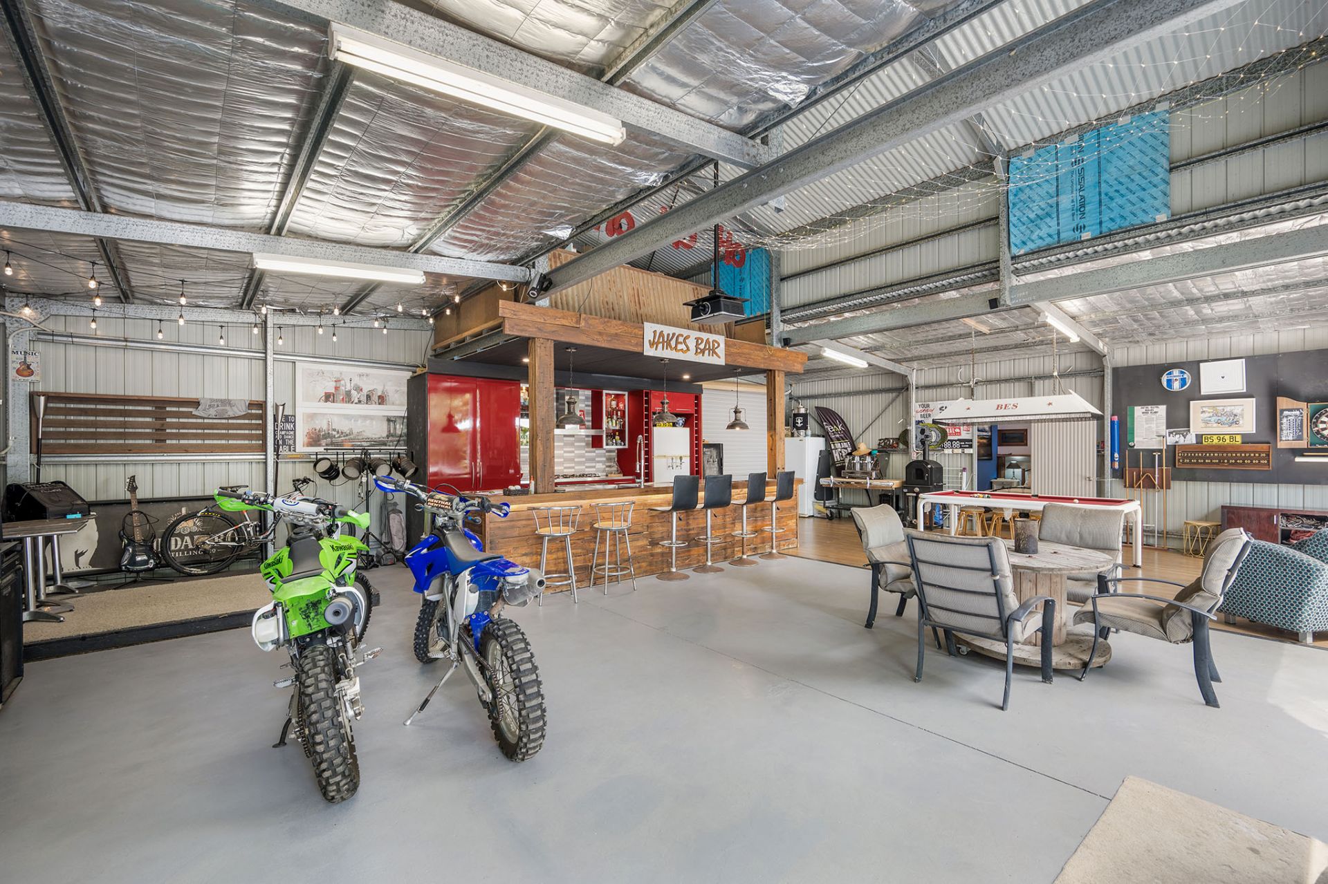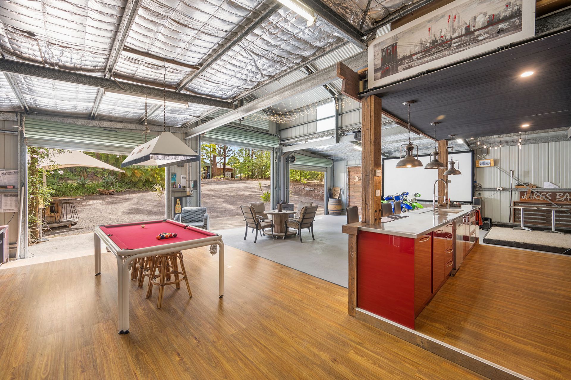 - Impressive 20x9m fully serviced barn-style machinery shed with workshop, studio and carport, complete with 240V and three-phase power