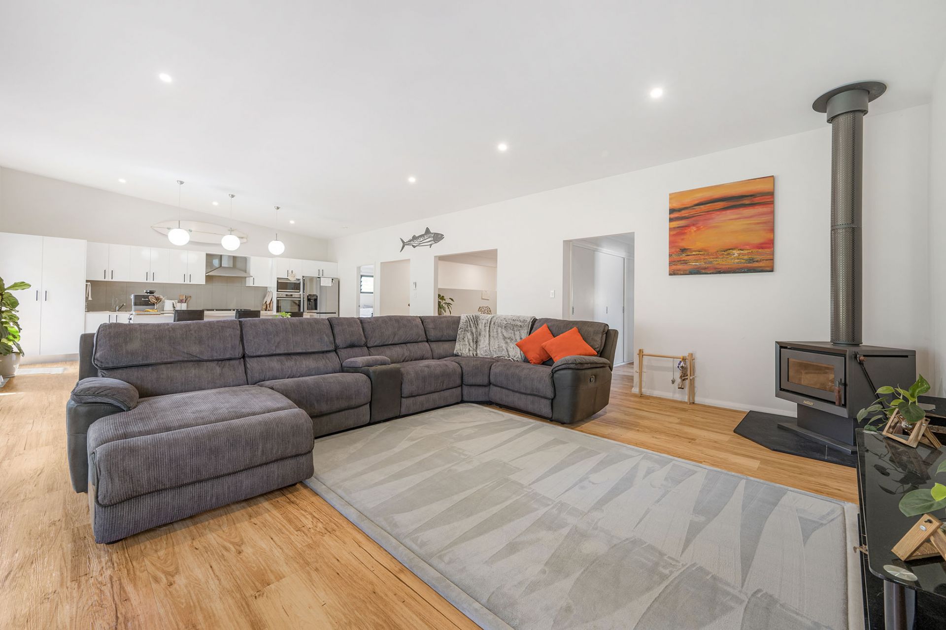 - Large open living room with vaulted ceilings, reverse cycle A/C, wood fire place