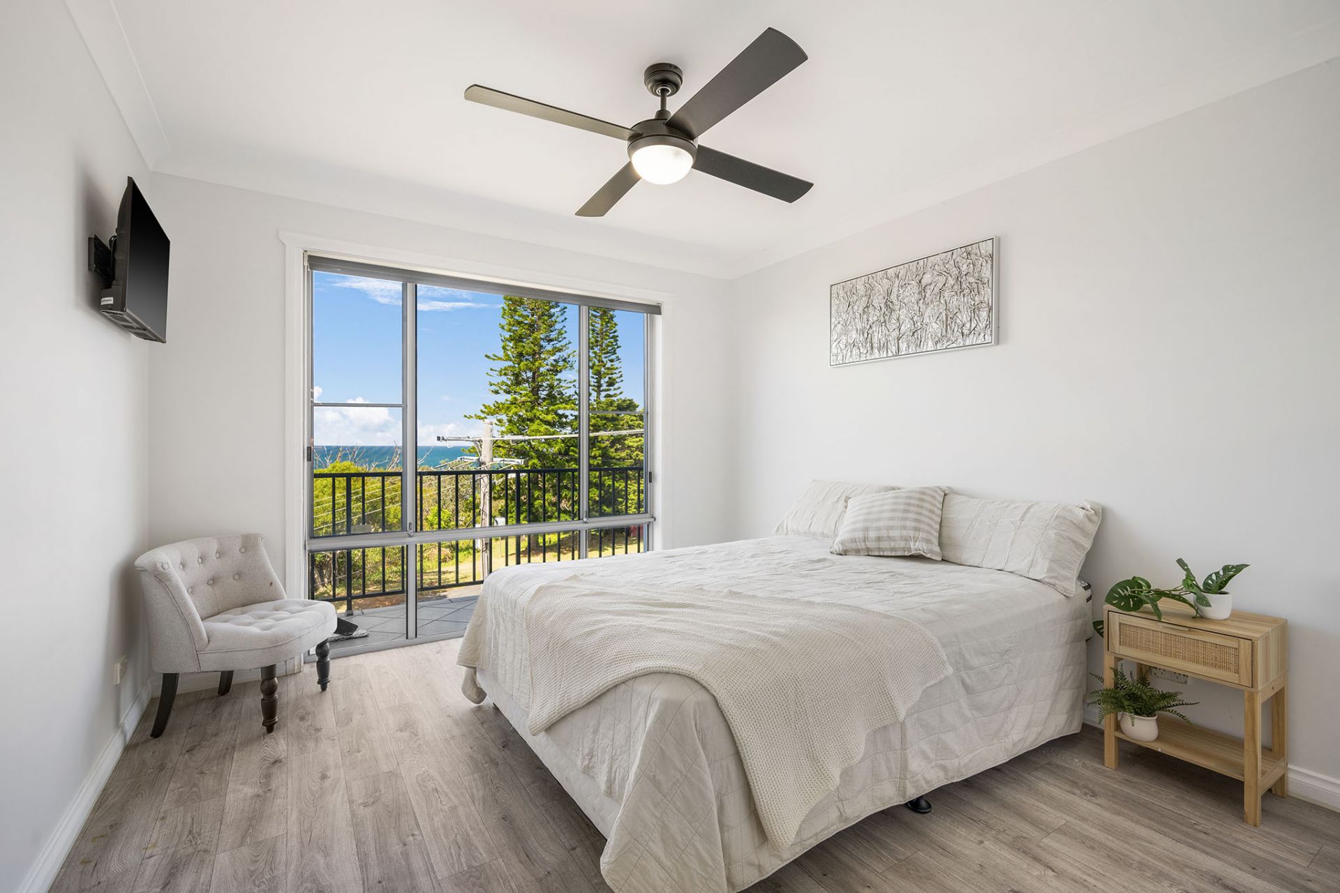 - Master suite with walk-in robe, ensuite, balcony access, and ocean views