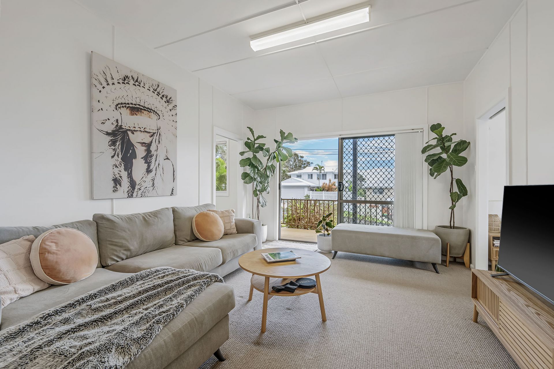 - Living room opening to an undercover balcony with ocean views