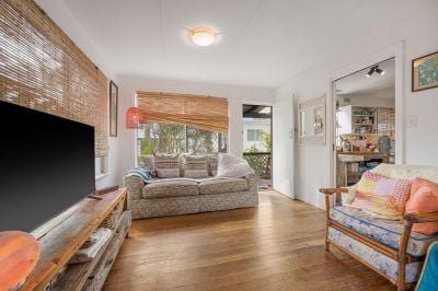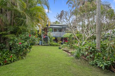 Ocean glimpses from the kitchen, living, and balcony invite the sea breeze indoors, while the warmth of original hardwood timber flooring adds timeless character. The main bedroom offers comfort with a built-in robe, while the wraparound undercover deck creates the perfect space to relax, reflect, or entertain against the backdrop of tropical gardens.