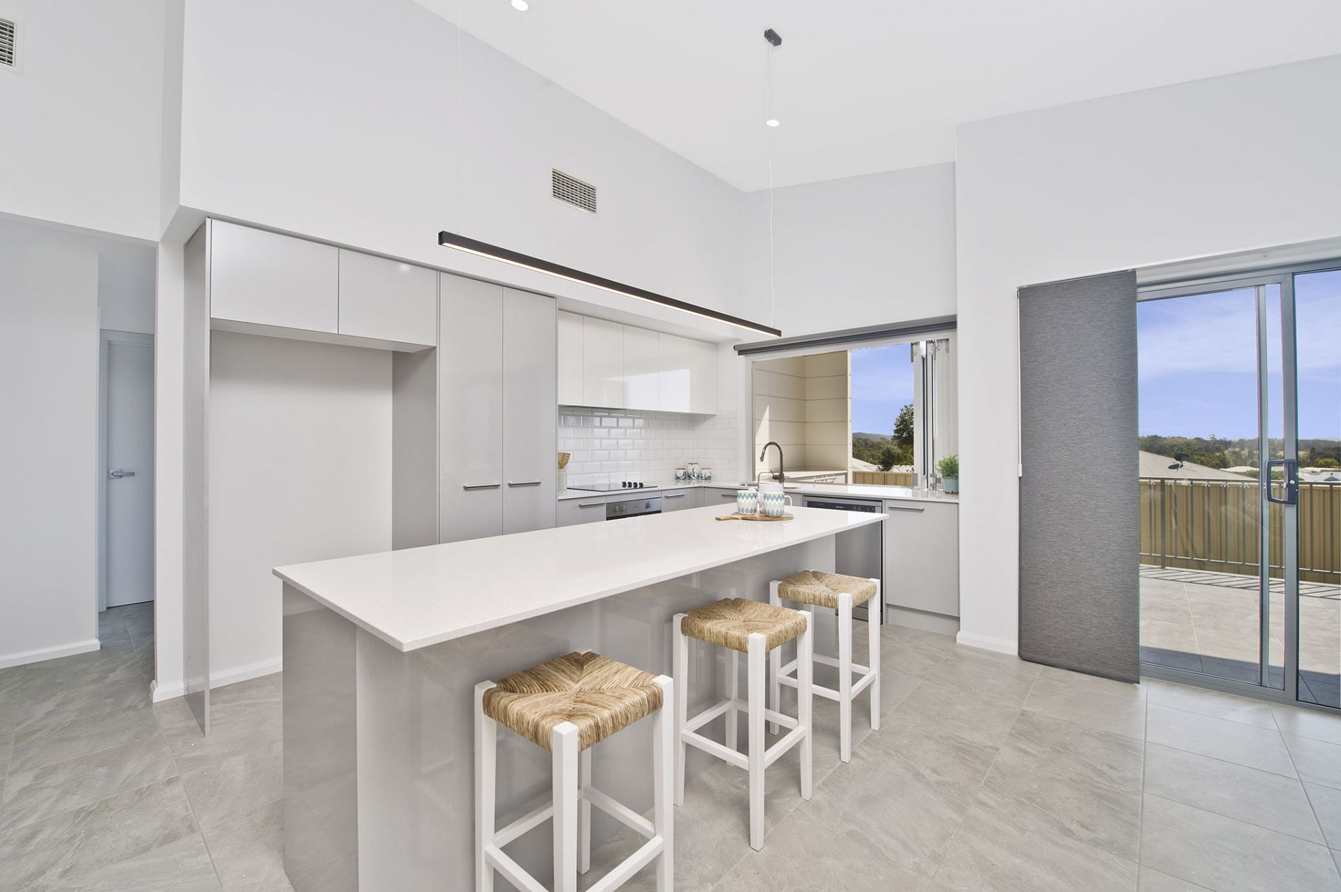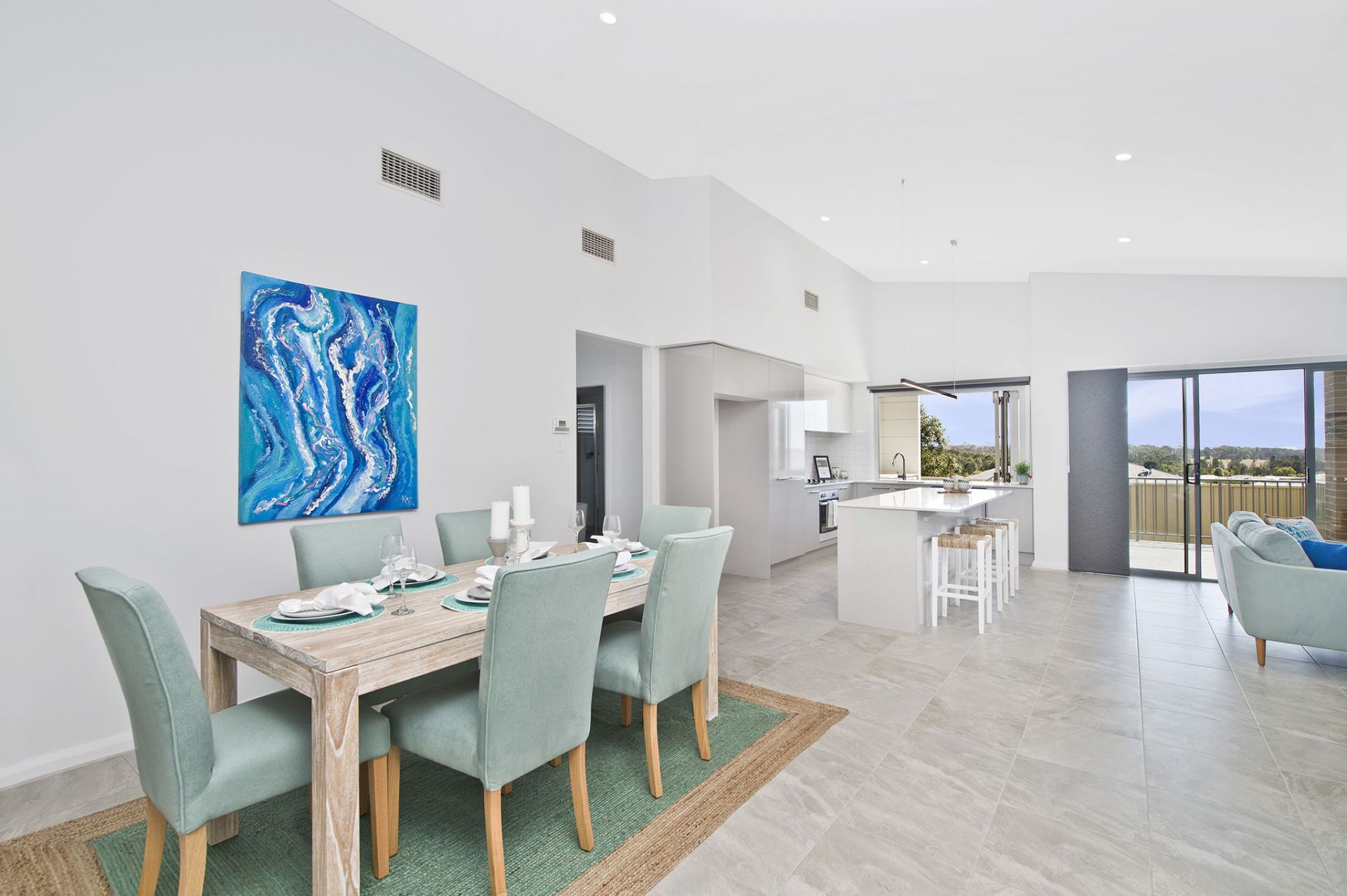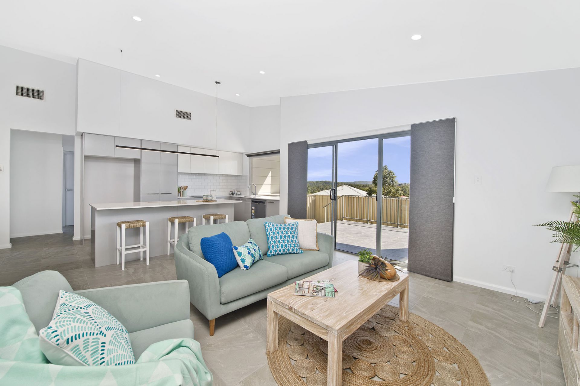 - Open plan living with raked ceiling, leading to a covered terrace and backyard
