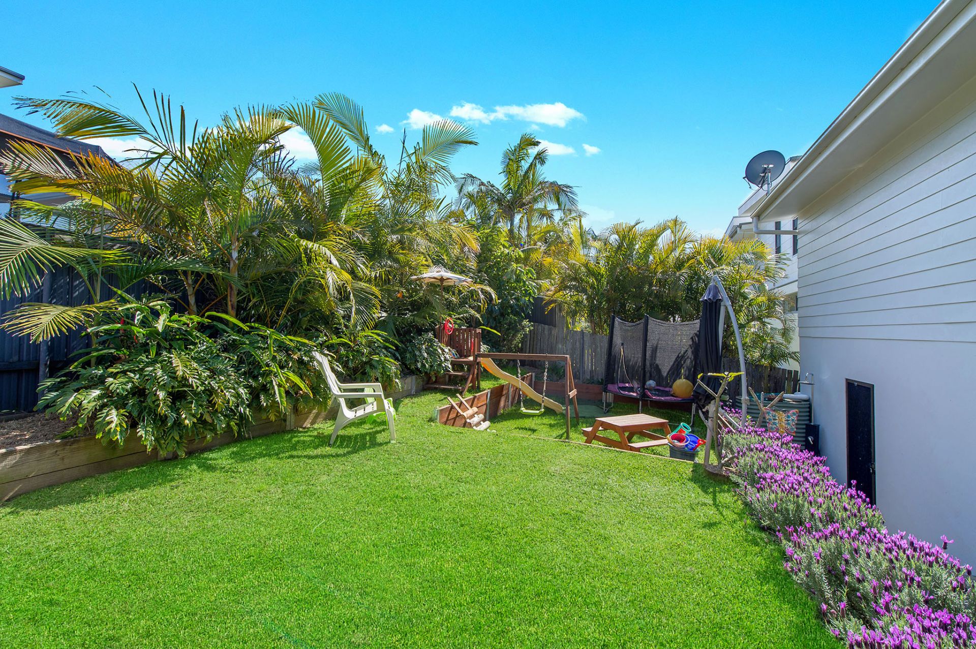 - Tranquil backyard oasis, featuring established gardens and a level front yard