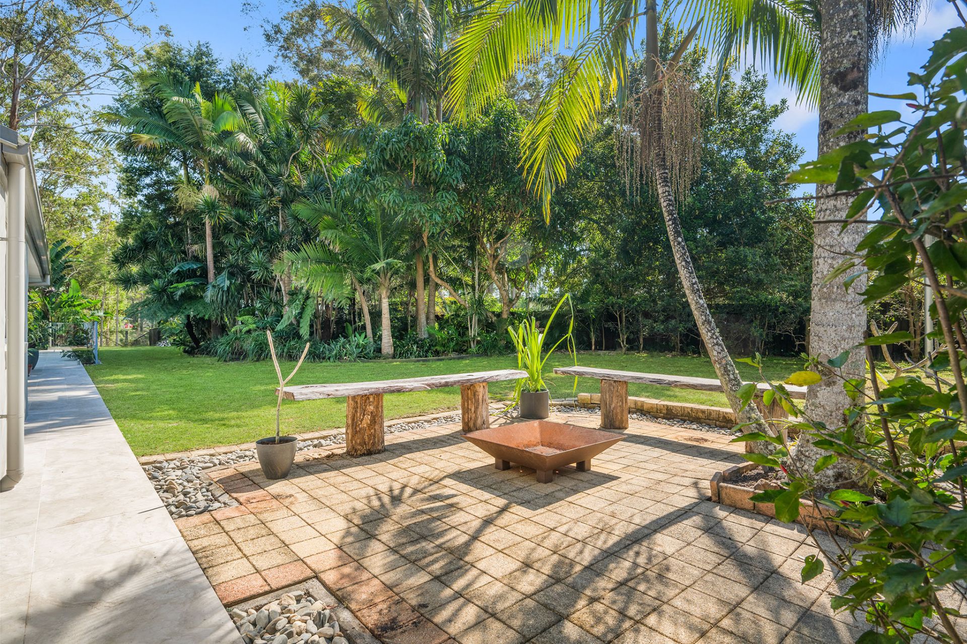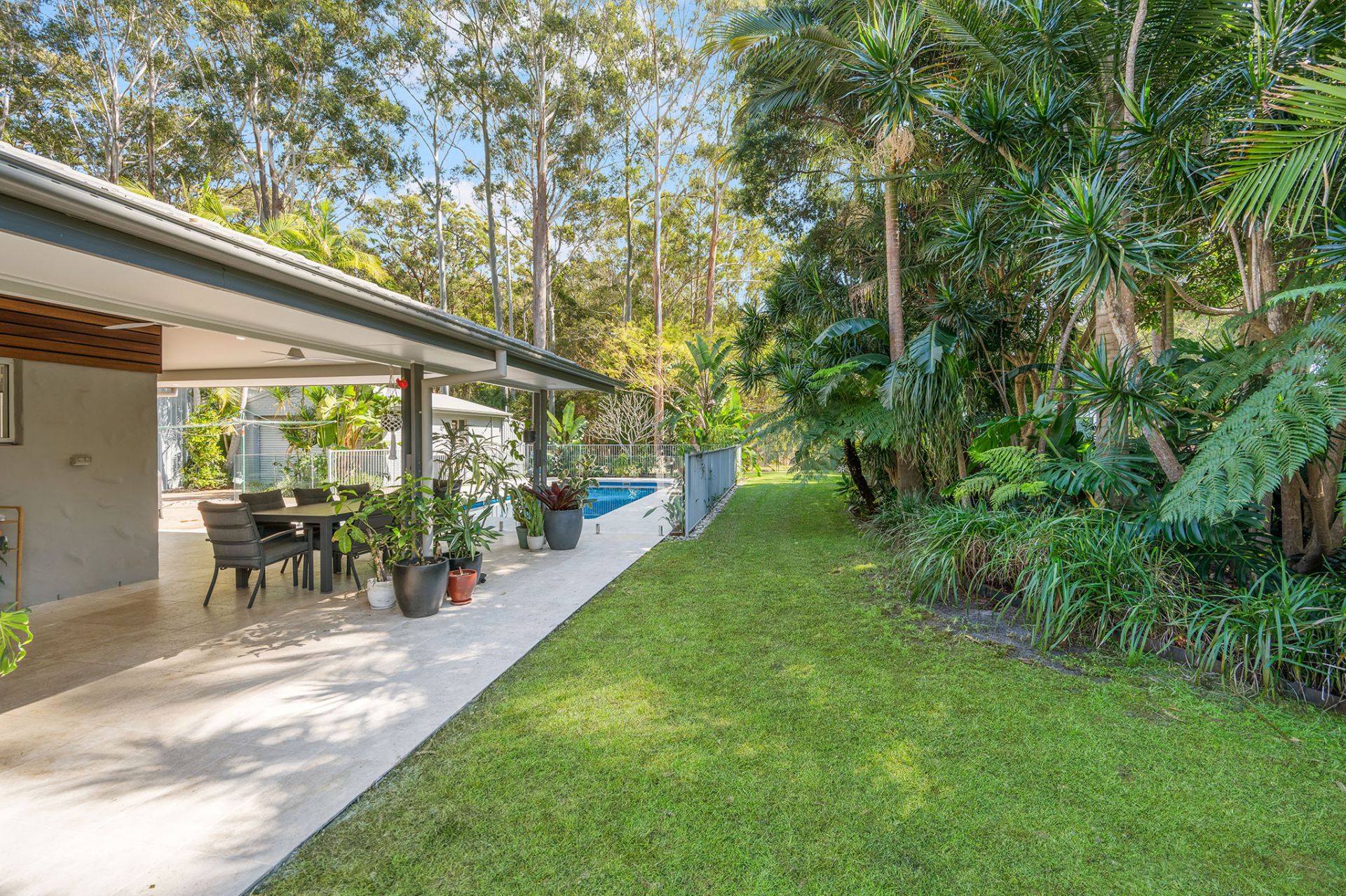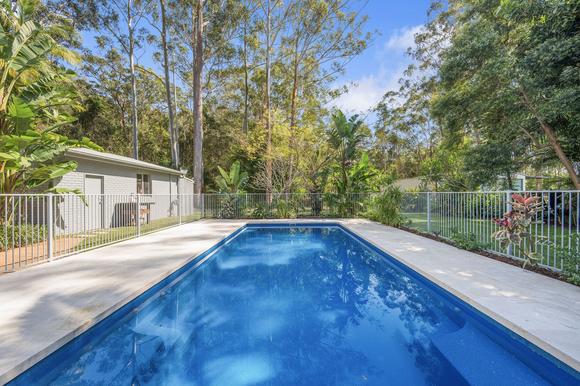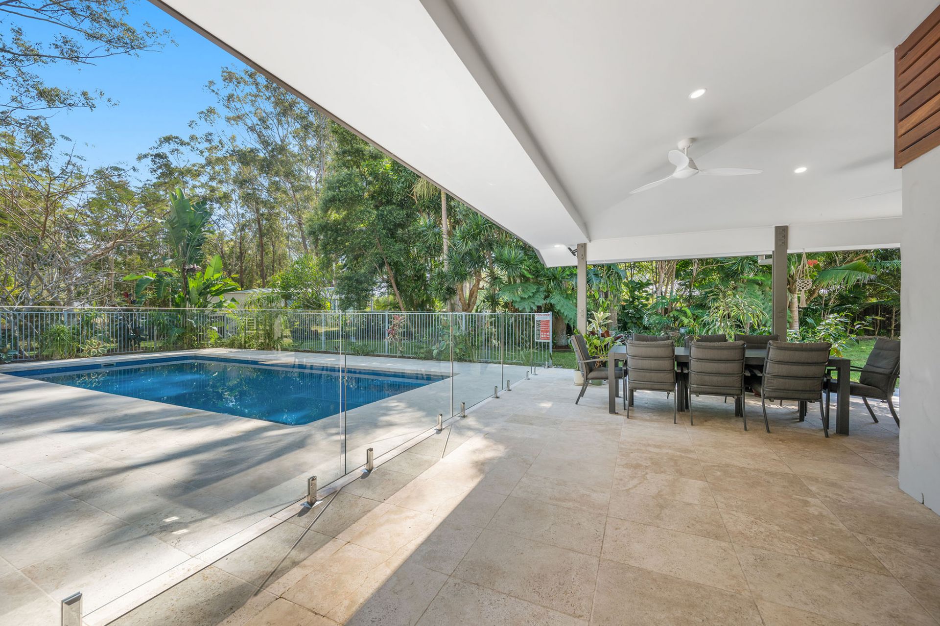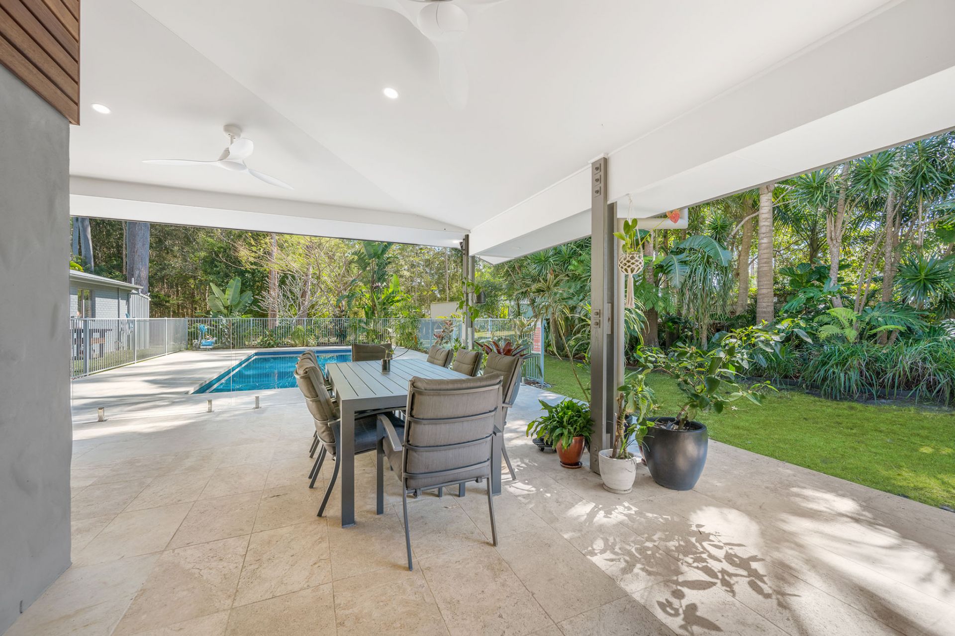 - Resort-style pool with travertine tiles and tropical gardens