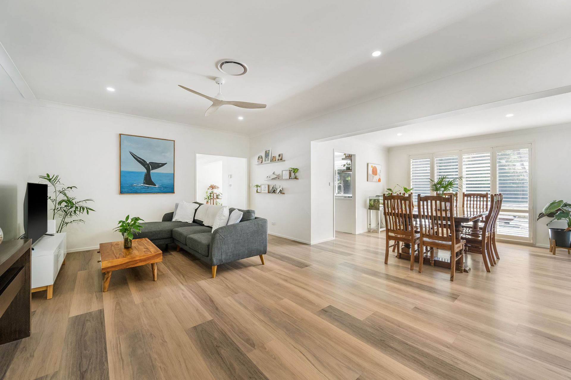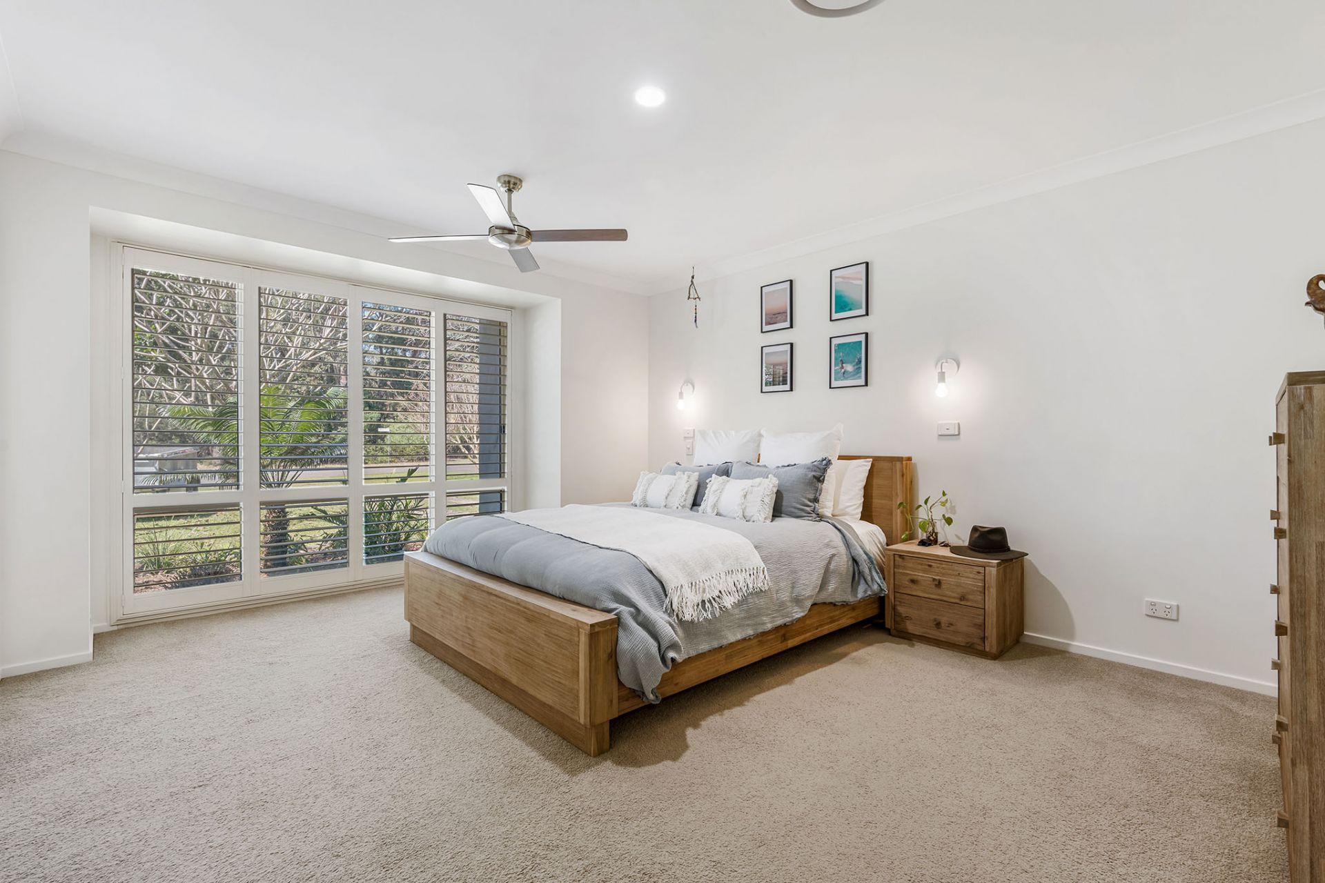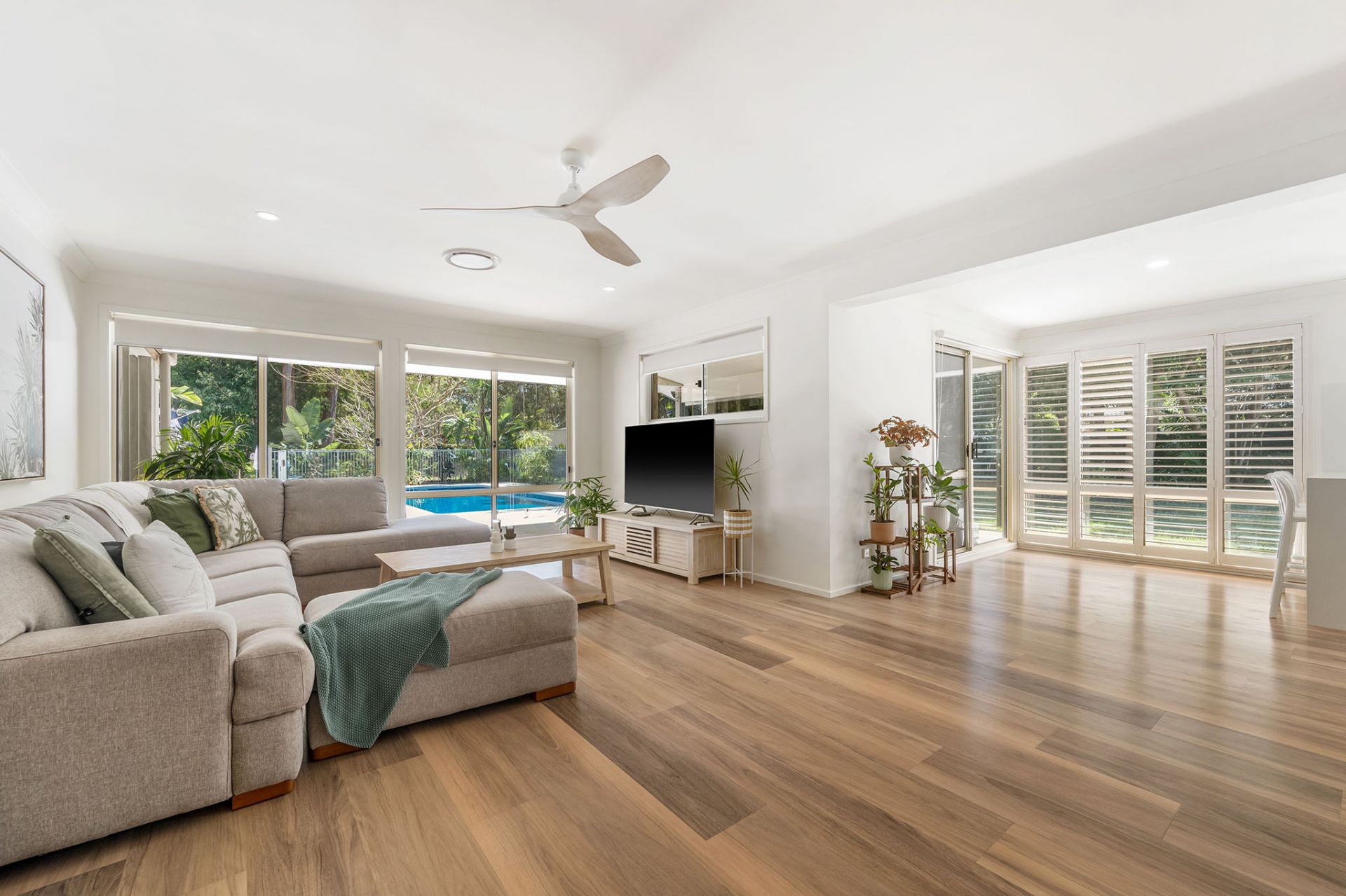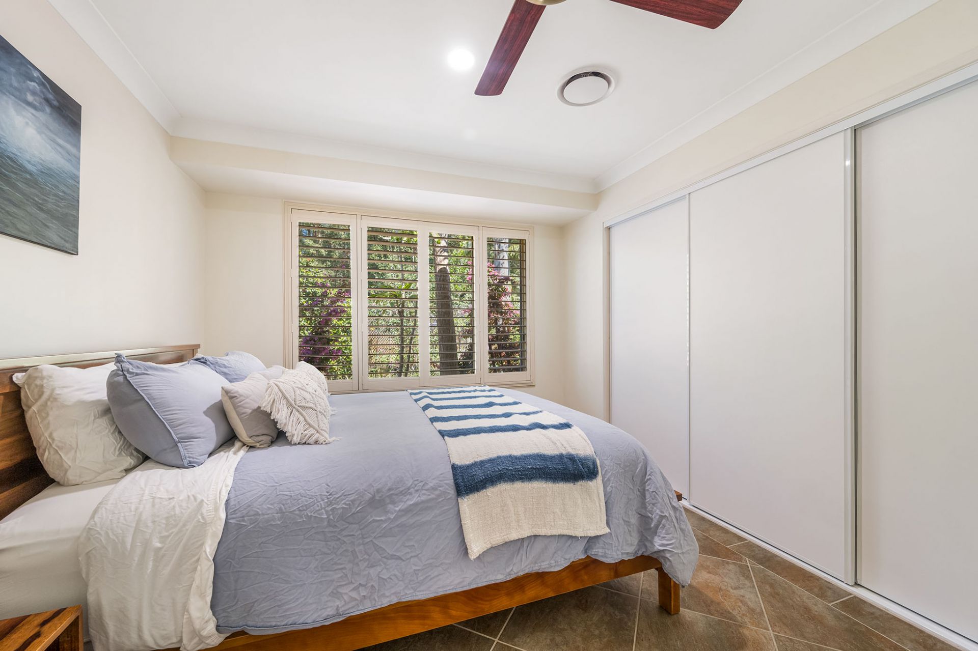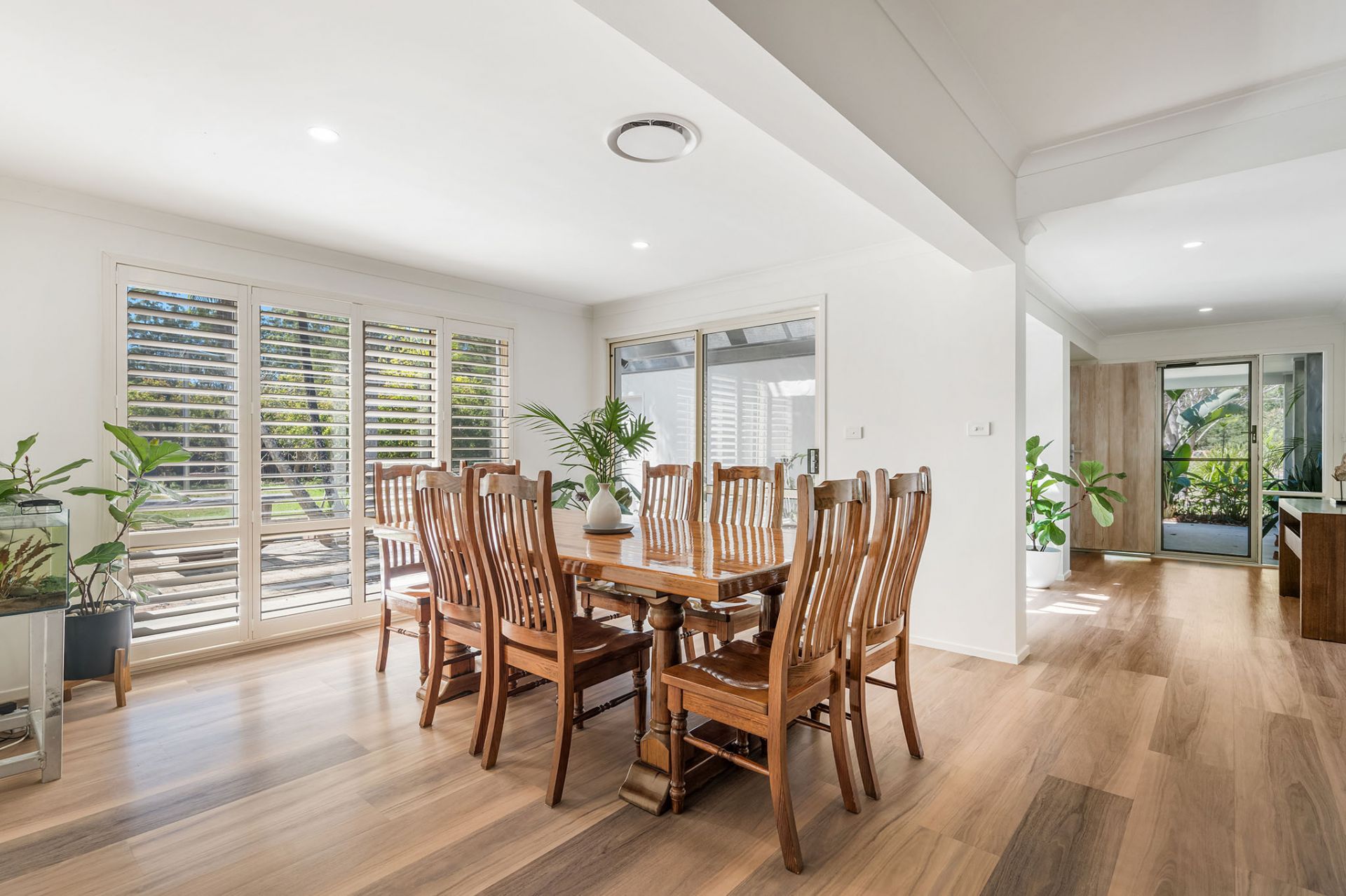 - Plantation shutters throughout for style and privacy